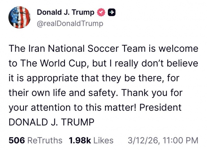 03月12日讯 美国总统特朗普在社媒发文,发表了自己对伊朗国家队参加世界杯的看法。